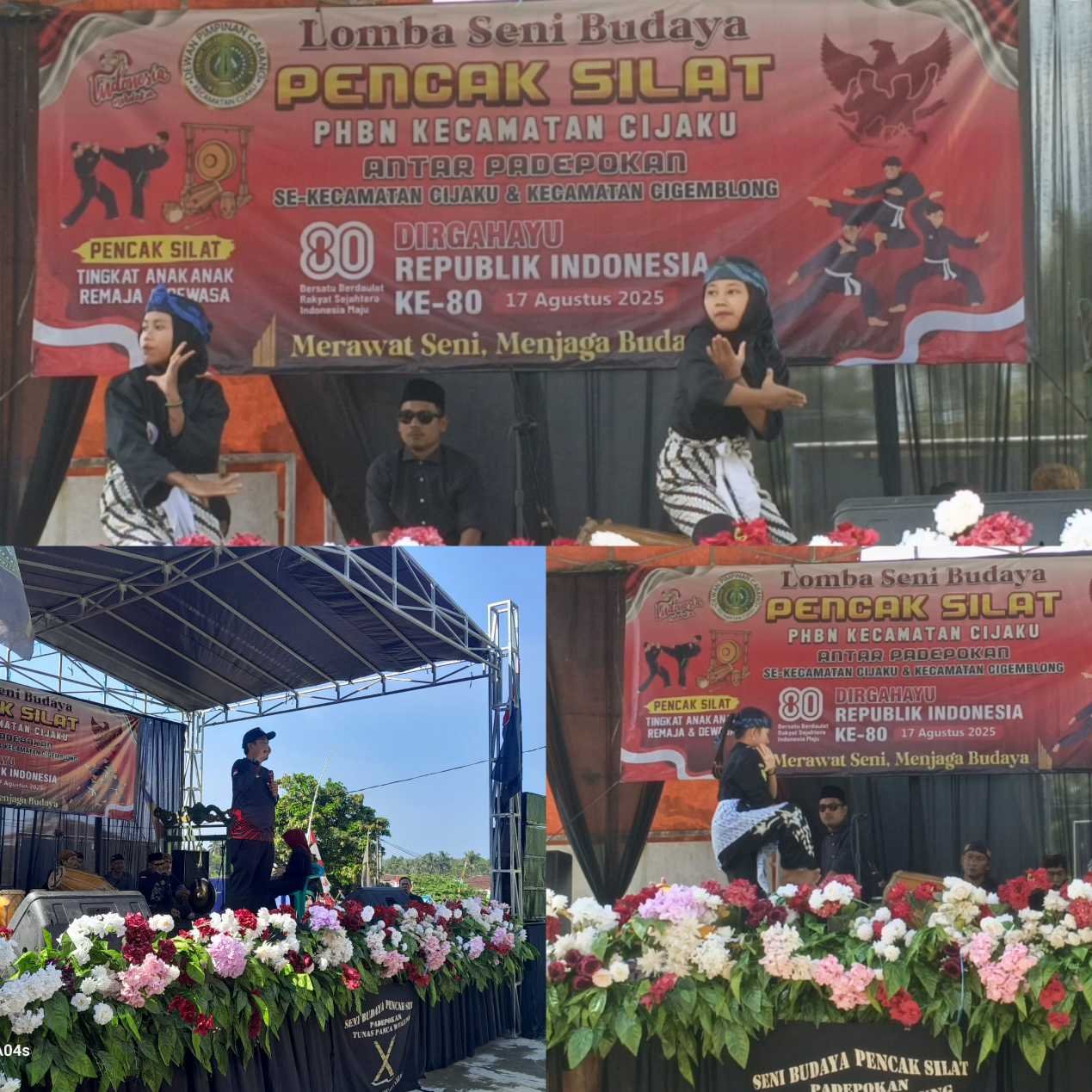 Lebak,- Camat kecamatan Cijaku, Cece Saputra, menyampaikan apresiasi yang tinggi atas kegiatan seni budaya Pencak Silat yang digelar dalam rangka memperingati Hari Ulang Tahun (HUT) Kemerdekaan Republik Indonesia (RI) ke-80. 13/08/2025