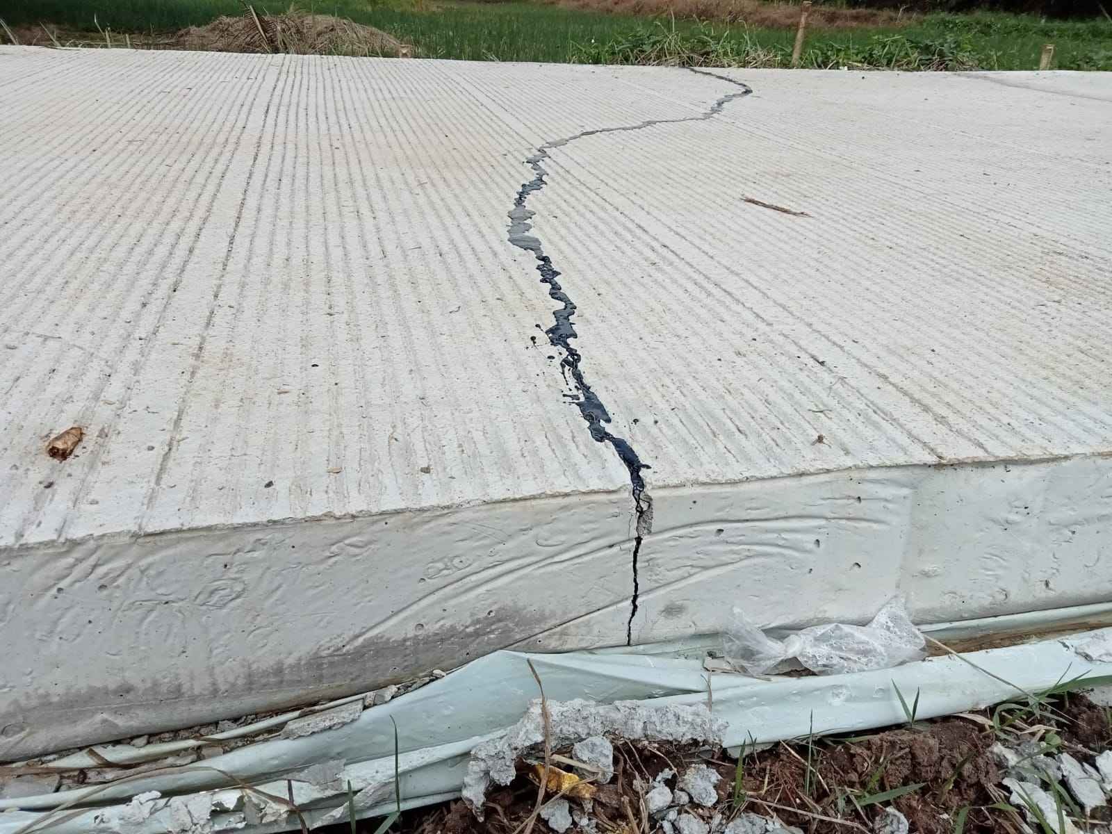 Diketahui dari hasil investigasi awak media dilokasi kegiatan. Diduga realisasi pembangunan jalan Poros Desa tersebut pecah atau retak tak beraturan secara horizontal sebanyak 23 titik.