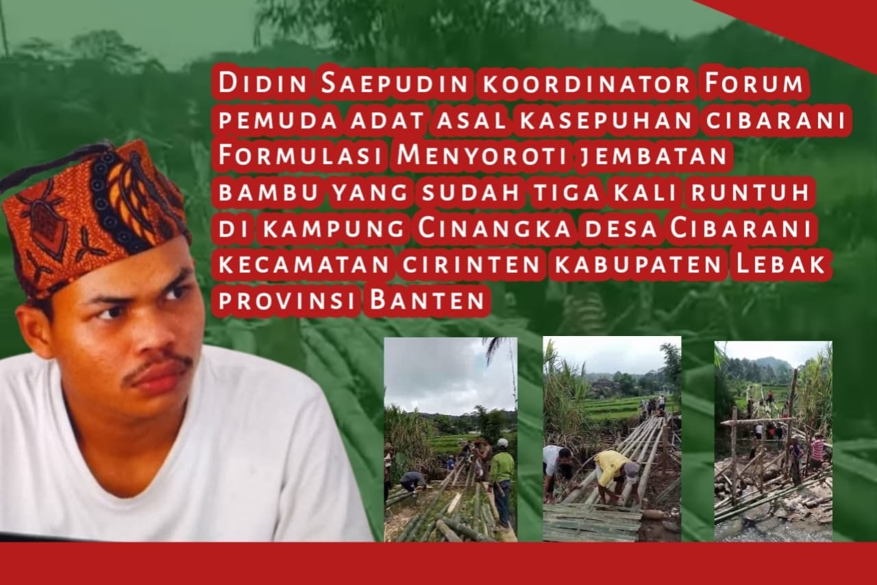 Lebak,- Didin Saepudin selaku Kordinator Forum Pemuda Adat Asal Kasepuhan Cibarani (FORMULASI) menyoroti kondisi jembatan bambu yang sudah tiga kali runtuh di kampung Cinangka Desa Cibarani Kecamatan Cirinten Jabupaten Lebak Provinsi Banten