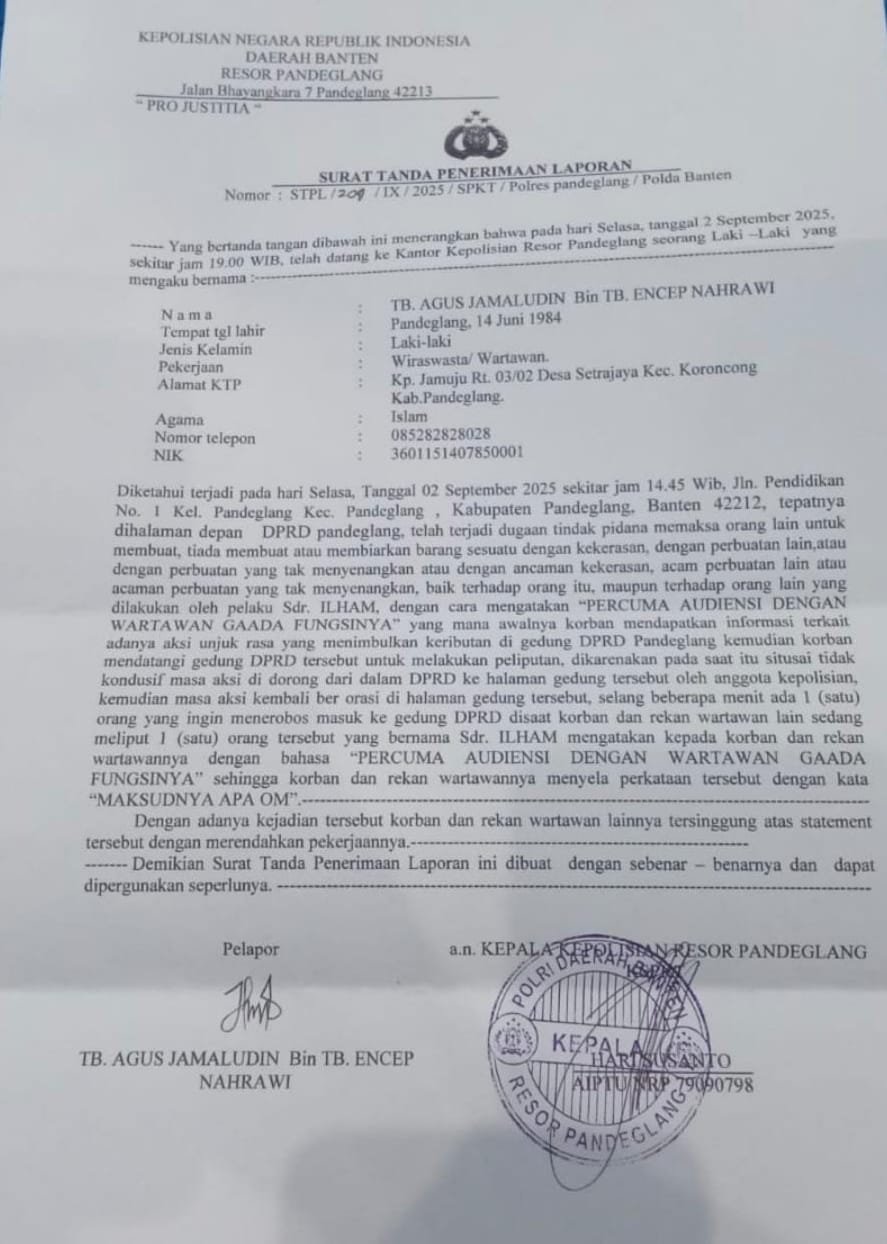 ‎Dengan adanya Surat tanda penerimaan laporan Nomor: STPL/204/IX/2025/SPKT/Polres Pandegkang/Polda Banten resmi melaporkan kepada oknum tersebut.